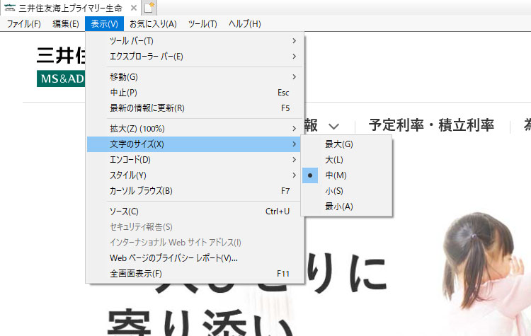 メニューの[表示]より[文字のサイズ]を選択し、サイズを選びます。