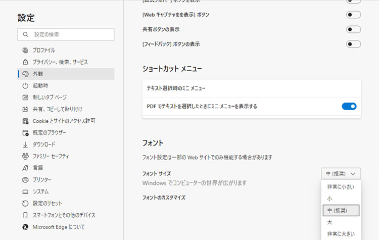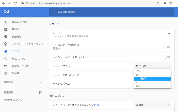 画面右上のメニューボタンより[設定]を選びます。[外観]を選択し、[フォント サイズ]より文字サイズを選びます。